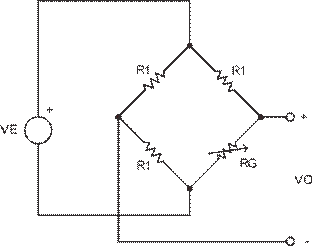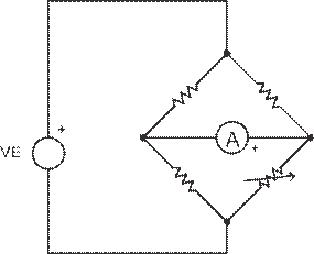 Wheatstone 橋接的原理是:如果交叉分支的三個電阻和電流均已知,則可計算得到第四個電阻。使用一個高靈敏度電流計,可以非常精確地探測到零電流,因此能夠非常精確地實施測量。所以,當電流為零時,橋接獲得平衡,而第四個電阻與其他三個電阻相等——但只有在這三個電阻都相等的條件下,如圖 2-3 所示。