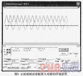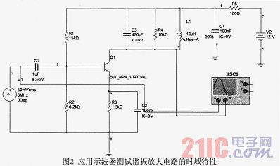在小信號諧振放大中,電路的輸入信號中除了所需要的信號外還有不需要的信號,它們的頻譜往往不同,所以用選頻的方法,選取需要的頻率分量,抑制不需要的頻率分量。另外,其中有用信號的幅度往往也很小,處理這種信號必須具有選頻和放大雙重功能。小信號諧振放大器電路中晶體管集電極負載是LC并聯(lián)諧振電路,其阻抗是隨頻率而變化的,回路諧振頻率f0上的阻抗為純電阻并且是最大的,因此諧振放大器在負載回路的諧振頻率上具有最大的電壓放大增益,稍離開此諧振中心頻率,電壓增益就會迅速減小。在分析中采用仿真軟件來測試諧振放大電路的時域的輸入輸出波形。分析測試電路如圖2所示。