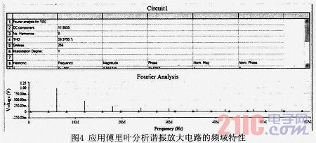 在頻域分析中就是以頻率作為分析的變量,分析信號中不同的頻率分量構(gòu)成。在頻率分析中,較為重要的概念就是電路的通頻帶與選擇性,作為諧振放大電路一方面要通過所需的頻率成分,因而對其具有通頻帶的要求,另一方面,要抑制不需要的信號的頻率成分,這種通過有效成分抑制無效成分的性質(zhì)稱為選擇性。但在實際應(yīng)用中往往要求通頻帶以內(nèi)傳輸系數(shù)盡可能大,通頻帶以外傳輸系數(shù)盡可能小,這樣信號失真小,抑制干擾能力強,由此可見通頻帶與選擇性相矛盾,故用矩形系數(shù)K0.1說明。理想諧振放大器的頻率特性曲線,其矩形系數(shù)K0.1應(yīng)等于1,實際的諧振放大器的矩形系數(shù)總是大于1的。應(yīng)用軟件的傅里葉分析的頻譜圖如圖4所示。
