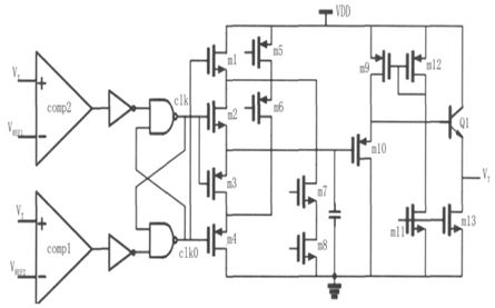 本文采用的三角波產(chǎn)生電路結(jié)構(gòu)如圖6 所示,其中m5、m6 和m7、m8 構(gòu)成了兩組恒流源,m9~m13 和Q1 構(gòu)成了輸出級(jí)。在電路中,采用將輸出信號(hào)VT 分別反饋到比較器comp1 和comp2,與參考電平VREF1 和VREF2(VREF2<VREF1)進(jìn)行比較,并通過一組數(shù)字電路產(chǎn)生兩路反向的時(shí)鐘信號(hào)clk 與clk0,來控制m2 和m3 的開啟和關(guān)斷,從而達(dá)到對(duì)電容C 進(jìn)行充放電,產(chǎn)生三角波信號(hào)VT 的目的。