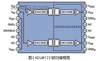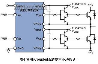 ADI公司的隔離門級(jí)驅(qū)動(dòng)器系列產(chǎn)品采用iCoupler技術(shù),其中雙通道 ADuM1233(圖3)提供了輸出通道和輸入通道之間的隔離以及兩個(gè)輸出通道之間的隔離,適用于IGBT控制通道的隔離。