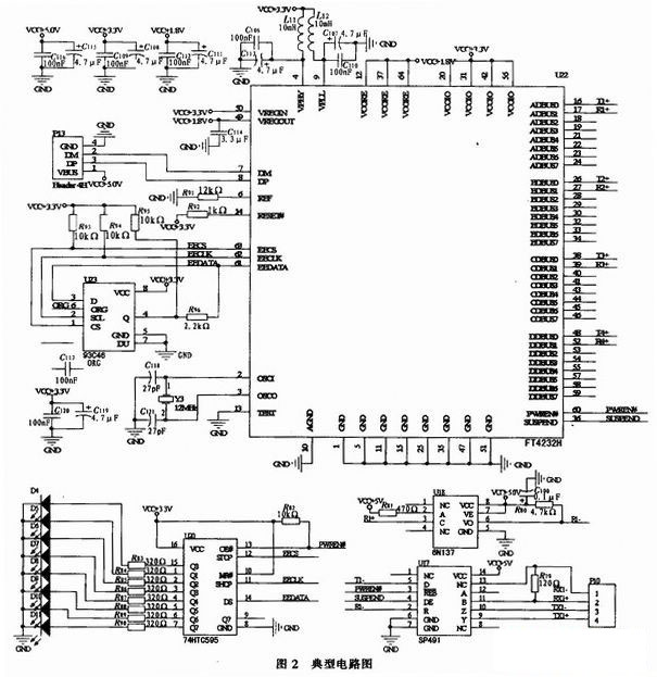 整個(gè)系統(tǒng)的供電來源于USB接口的+5 V;因此芯片工作在USB總線供電模式,典型電路如圖2所示,采用標(biāo)準(zhǔn)的USB接口P1,F(xiàn)T4232H提供了標(biāo)準(zhǔn)的發(fā)送TX和接收RX引腳輸出輸入線,因此與外設(shè)的連接方式非常靈活、方便。跟RS422的連接方式如圖中所示,為方便只給出了發(fā)送和接收兩組差分信號(hào)線,通過PWREN#和SUSPEND#的輸出來控制信號(hào)的發(fā)送和接收。圖中94C46是一片串行的EEPROM,用于存儲(chǔ)產(chǎn)品的VID、PID、設(shè)備序列號(hào)以及與設(shè)備相關(guān)的文字說明,芯片的容量大小可以根據(jù)用戶需要進(jìn)行選擇,本文中選用的是容量為1 K的芯片。雖然轉(zhuǎn)換器在沒有EEPROM芯片一樣可以正常工作,但這時(shí)設(shè)備的工作方式是FTDI公司默認(rèn)的內(nèi)容,如果用戶想寫入自己的VID、PID等信息必須外接一片EEPRO-M,其具體內(nèi)容有一定的格式,本設(shè)計(jì)的工作方式是FTDI公司默認(rèn)的。