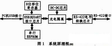 系統(tǒng)原理框圖如圖1所示。USB的一大優(yōu)點(diǎn)是可以提供500 mA的5 V電源,因此,設(shè)計(jì)時(shí)可以采用總線供電。信號(hào)通過FT4232H接口芯片,內(nèi)部處理后轉(zhuǎn)換成4路接口信號(hào)。4路相同的信號(hào),通過光電隔離后再經(jīng)過RS422電平轉(zhuǎn)換芯片轉(zhuǎn)換為RS422信號(hào)。光電隔離芯片是6N137,由于光電隔離左右端電源要求隔離,所以采用DC-DC芯片F(xiàn)0505S-1WR,電平轉(zhuǎn)換芯片采用的是SP491,8位移位寄存器采用的是SN74HCT595,主要是用來顯示各路的發(fā)送接收狀態(tài),而串行EEPROM采用的是93C46B,用來對(duì)數(shù)據(jù)進(jìn)行一定的存儲(chǔ)。