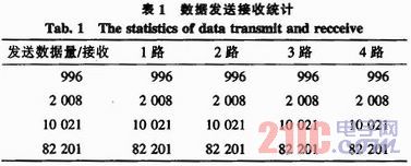 我們?cè)跍y(cè)試中利用串口助手,波特率設(shè)為115 200,測(cè)試結(jié)果如圖3所示,實(shí)踐證明,使用FT4232H芯片設(shè)計(jì)出來的USB轉(zhuǎn)換器可使在串口RS422和USB口之間非常容易地建立可靠的連接。能夠同時(shí)接收來自四路RS422接口的數(shù)據(jù),而且此四路RS422接口任何一路或者多路停止傳送數(shù)據(jù),對(duì)其他路數(shù)的數(shù)據(jù)傳送沒有任何的影響。說明四路RS422接口相互之間是獨(dú)立工作的。同時(shí)我們也做了數(shù)據(jù)的掉包統(tǒng)計(jì),如表1所示。從表1結(jié)果表明,在發(fā)送數(shù)據(jù)的過程中,并沒有出現(xiàn)掉包的情況,因此達(dá)到了設(shè)計(jì)要求。