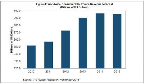 但不都是負(fù)面消息。雖然第二和第三季度的消費(fèi)電子營業(yè)收入低于去年同期水平,但隨著電視與藍(lán)光播放器假日銷售高于2010年水平,上述趨勢將從第四季度開始逆轉(zhuǎn)。IHS公司認(rèn)為,預(yù)計2012和2013年增長率將超過4%,相比于當(dāng)前的低迷狀態(tài),屆時多數(shù)消費(fèi)電子領(lǐng)域?qū)謴?fù)活力。