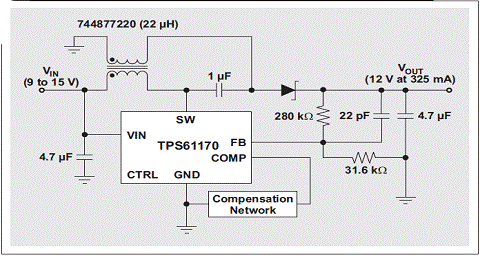 盡管DC/DC單端初級(jí)電感轉(zhuǎn)換器 (SEPIC) 拓?fù)洳皇鞘裁葱聳|西,但的確直到最近它才開(kāi)始流行起來(lái),然而,對(duì)于能夠?qū)Ω叩洼斎腚妷褐g的輸出電壓(例如:12V未校準(zhǔn)插墻式電源)進(jìn)行調(diào)節(jié)的轉(zhuǎn)換器需求一直都存在。雖然我們可以將任何升壓轉(zhuǎn)換器/控制器配置為一個(gè) SEPIC,但其在最近才得到普遍的使用。兩個(gè)因素促進(jìn)了 SEPIC 的人氣大增:(1) IC 制造廠商已經(jīng)開(kāi)始制造更多具有電流模式控制功能的升壓控制器,旨在簡(jiǎn)化補(bǔ)償;(2) 電感制造廠商已經(jīng)開(kāi)始制造許多可以最小化轉(zhuǎn)換器總 PCB 體積的單封裝耦合電感。改用耦合電感以后,許多具有兩個(gè)單獨(dú)電感應(yīng)用的電源體積可以縮減三分之一。圖 1 顯示了使用 TI TPS61170 和 Wuerth 744877220 的一個(gè) SEPIC。