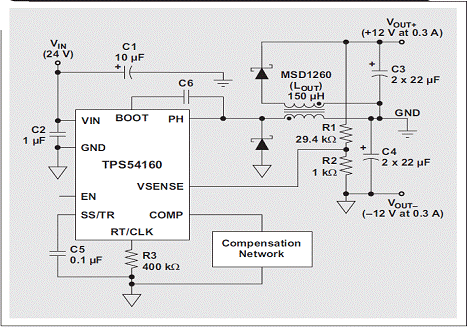 匹配正負(fù)電源軌是許多工業(yè)應(yīng)用的常見(jiàn)要求,對(duì)放大器而言更是如此。我們可以對(duì)寬輸入范圍降壓轉(zhuǎn)換器進(jìn)行配置,以提供負(fù)輸出電壓。使用一個(gè)耦合電感代替這種反相降壓轉(zhuǎn)換器的電感,并增加一個(gè)二極管和電容器,便可將這種反相降壓轉(zhuǎn)換器變?yōu)橐粋€(gè)雙輸出的轉(zhuǎn)換器。圖 3 顯示了以這種方法使用的 TI TPS54160 和 Coilcraft 150-μH MSD1260。只要每個(gè)軌的負(fù)載稍有接近,我們就對(duì)每個(gè)軌之間的差異進(jìn)行調(diào)節(jié)而非單獨(dú)調(diào)節(jié)每個(gè)軌,但耦合電感卻可以幫助提供對(duì)每個(gè)軌進(jìn)行調(diào)節(jié)。