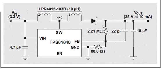 集成 FET 的 DC/DC 轉(zhuǎn)換器的輸出電壓受限于轉(zhuǎn)換器的開(kāi)關(guān)電流額定值。將一個(gè) 1:1 以上匝比的耦合電感連接至轉(zhuǎn)換器的開(kāi)關(guān) (SW) 引腳,可以擴(kuò)展所有升壓轉(zhuǎn)換器的有效輸出電壓范圍。例如,圖 4 顯示了 30-V 絕對(duì)最大電流額定值的 TI TPS61040 升壓轉(zhuǎn)換器,其作用是提供 35V 或更高的電壓,同時(shí)還顯示了一個(gè) 1:2 耦合電感 Coilcraft LPR4012-103B。耦合電感結(jié)構(gòu)多繞組端與二極管串聯(lián)時(shí),單繞線電感——以及由此產(chǎn)生的轉(zhuǎn)換器開(kāi)關(guān) FET—電壓只有輸出電壓的三分之一,即負(fù)輸入電壓。