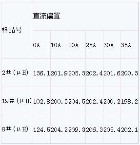 將表1所測試的電感插入恒磁片后,再加工成成品電感,取三個(gè)成品作測試樣品,測試其直流特性如表2所示(測試儀表為HP4284A,測試頻率為1kHz):