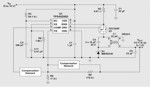 圖2使用TI TPS40200 和Coiltronics DRQ74 的ZETA 轉(zhuǎn)換器