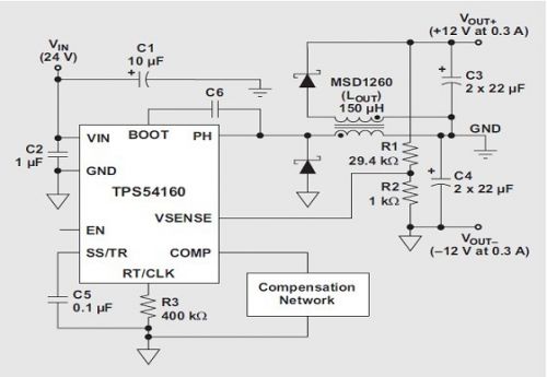 匹配正負(fù)電源軌是許多工業(yè)應(yīng)用的常見要求,對放大器而言更是如此。我們可以對寬輸入范圍降壓轉(zhuǎn)換器進(jìn)行配置,以提供負(fù)輸出電壓。使用一個耦合電感代替這種反相降壓轉(zhuǎn)換器的電感,并增加一個二極管和電容器,便可將這種反相降壓轉(zhuǎn)換器變?yōu)橐粋€雙輸出的轉(zhuǎn)換器。圖 3 顯示了以這種方法使用的 TI TPS54160 和 Coilcraft 150-μH MSD1260。只要每個軌的負(fù)載稍有接近,我們就對每個軌之間的差異進(jìn)行調(diào)節(jié)而非單獨(dú)調(diào)節(jié)每個軌,但耦合電感卻可以幫助提供對每個軌進(jìn)行調(diào)節(jié)。