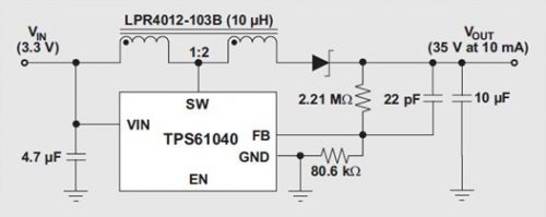 集成 FET 的 DC/DC 轉(zhuǎn)換器的輸出電壓受限于轉(zhuǎn)換器的開關(guān)電流額定值。將一個 1:1 以上匝比的耦合電感連接至轉(zhuǎn)換器的開關(guān) (SW) 引腳,可以擴(kuò)展所有升壓轉(zhuǎn)換器的有效輸出電壓范圍。例如,圖 4 顯示了 30-V 絕對最大電流額定值的 TI TPS61040 升壓轉(zhuǎn)換器,其作用是提供 35V 或更高的電壓,同時還顯示了一個 1:2 耦合電感 Coilcraft LPR4012-103B。耦合電感結(jié)構(gòu)多繞組端與二極管串聯(lián)時,單繞線電感——以及由此產(chǎn)生的轉(zhuǎn)換器開關(guān) FET—電壓只有輸出電壓的三分之一,即負(fù)輸入電壓。