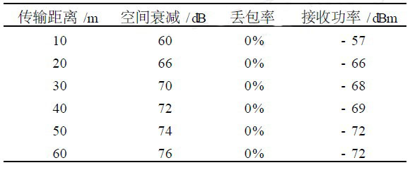 ①無(wú)障礙狀態(tài)下,隨著距離的增加,數(shù)據(jù)丟包率、接收功率和自由空間衰減的變化情況;