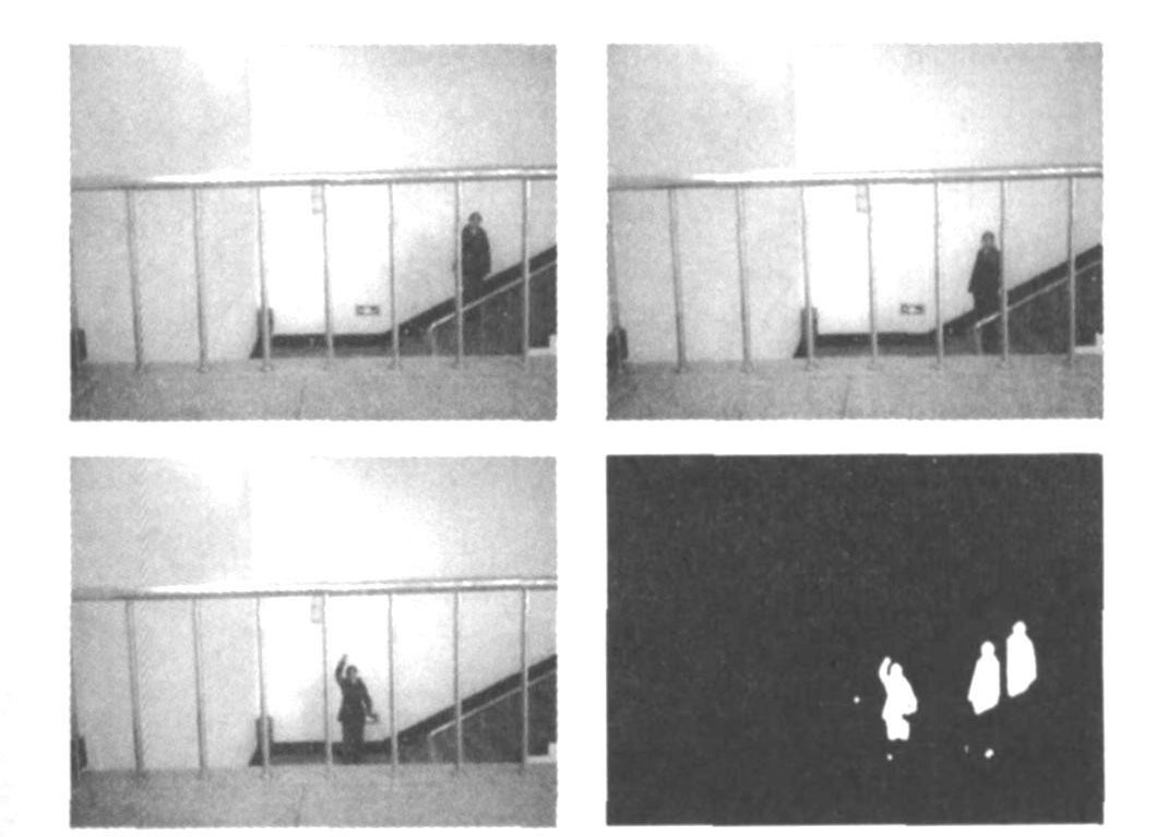 本系統(tǒng)采用運(yùn)動(dòng)目標(biāo)檢測(cè)算法,實(shí)現(xiàn)對(duì)監(jiān)視對(duì)象的圖像處理與異常判斷,占背景面積8‰的小目標(biāo)都能被系統(tǒng)識(shí)別。系統(tǒng)有效消除了因環(huán)境光線變化、背景微變、小目標(biāo)漸進(jìn)運(yùn)動(dòng)等因素引起的系統(tǒng)誤判。采用本系統(tǒng)軟、硬件進(jìn)行入侵事件檢測(cè),其實(shí)驗(yàn)圖片及檢測(cè)效果如圖5所示。