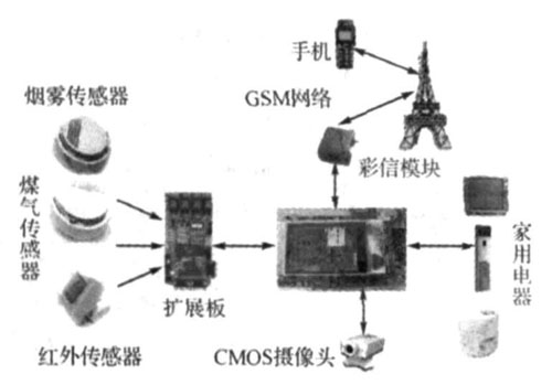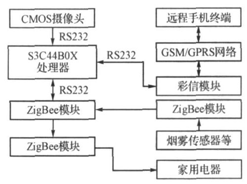 本系統(tǒng)采用模塊化設(shè)計(jì)方案。以嵌入式系統(tǒng)主板為核心,通過(guò)CMOS攝像頭對(duì)關(guān)鍵部位進(jìn)行安全監(jiān)測(cè),通過(guò)手機(jī)傳遞安全信息和圖像彩信,并對(duì)家用電器進(jìn)行遠(yuǎn)程控制,利用ZigBee模塊實(shí)現(xiàn)家用電器、系統(tǒng)主板和煙霧、溫度、煤氣等傳感器的無(wú)線聯(lián)網(wǎng)。