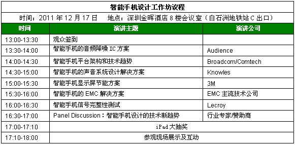 - 智能手機(jī)設(shè)計工作坊將于2011年12月17日下午在深圳金暉酒店召開
