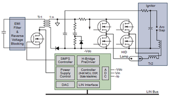 安森美半導(dǎo)體的全功能高強(qiáng)度放電(HID)(或氙燈)專用集成電路有助于改善前燈系統(tǒng)的性能。相對于傳統(tǒng)的鹵素?zé)?,HID改善了顯色性,降低了功耗,使用壽命更長,光輸出更高。為了支持其先進(jìn)的功能,需要高效率的HID大燈鎮(zhèn)流器和復(fù)雜的控制電路。安森美半導(dǎo)體的HID燈控制系統(tǒng)是采用8位微控制器或?qū)S脿顟B(tài)機(jī)的混合模擬/數(shù)字解決方案,它集成了DC-DC控制器,具備全面的診斷功能(過壓、欠壓、溫度傳感器、續(xù)航時(shí)間計(jì)數(shù)器)、各種通信接口(LIN、SPI),支持35 W(D1/D2/D3/D4)和25 W(D5)燈。圖3為該專用集成電路的框圖。