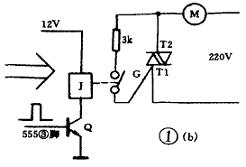 正確的方式見圖1b。可控硅與抽水電機(jī)組成抽水控制開關(guān),SCR的觸發(fā)由T2與G間接入電阻控制。當(dāng)水位降低時,控制觸點開路,555第3腳輸出高電平(此電路部分省略),使Q導(dǎo)通,繼電器J吸合,SCR觸發(fā)導(dǎo)通,電機(jī)開始運(yùn)轉(zhuǎn)。當(dāng)水位達(dá)到時, 觸點經(jīng)水接通,555第3腳輸出低電平,Q截止,SCR在交流電過零時截止,抽水停止。