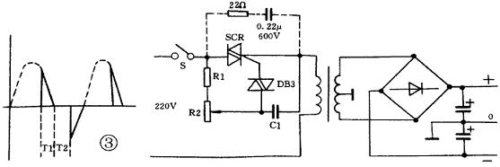圖3是某電子雜志刊出的無級直流輸出調(diào)壓電路。原作者稱,利用Rc移相網(wǎng)路控制SCR的導(dǎo)通角改變變壓器初級的電流,從而獲得兩路連續(xù)可調(diào)的2x(0—17V) 的直流輸出電壓,負(fù)載電流為800mA 。很明顯,推薦電路(圖3)是普通移相式調(diào)功電路和降壓變壓器整流濾波電路的串聯(lián), 從基本原理分析,似乎無大的原則問題。變壓器初級每半周電流有效值隨可控硅導(dǎo)通角變化,次級輸出電壓的峰值、平均電流值都隨之而變。當(dāng)然,一定負(fù)載時輸出整流電壓也必然改變。本人看后,極感興趣,依此原理制作了一臺輸出100±40V范圍變化的維修代用直流電源,并依照圖中虛線加入RC吸收回路。實驗時,該電路一接入電源,距此10米遠(yuǎn)的電視機(jī)屏幕上即出現(xiàn)兩條緩慢移動的黑帶(從鄰居的責(zé)問中得知),同時,空載下不到十分鐘,SCR即擊穿。更不能容忍的是,降壓變壓器鐵心發(fā)出拖拉機(jī)啟動時的聲音,室內(nèi)電度表也發(fā)出同樣的聲音,而且,隨著輸出電壓的調(diào)低,聲音更大。
