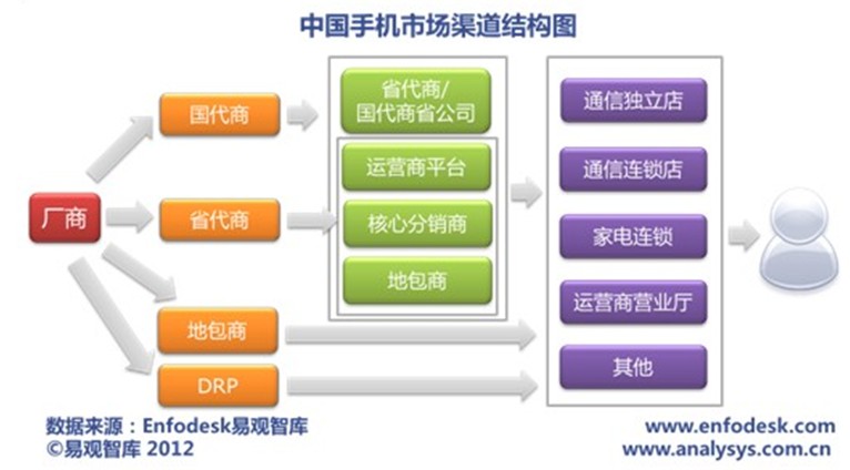 根據(jù)易觀智庫分析,目前我國手機(jī)市場渠道開始進(jìn)入轉(zhuǎn)型期。首先一個(gè)比較明顯的變化是手機(jī)廠商直供模式的加強(qiáng),渠道的扁平化趨勢進(jìn)一步加劇。比較明顯的一個(gè)例子是三星手機(jī)的渠道改革,從2010年12月起,三星手機(jī)全面推行了直供模式,經(jīng)過一年多的發(fā)展,三星對(duì)手機(jī)渠道的把控能力不斷得到了提升。