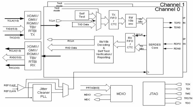下面詳細(xì)介紹了6個功能模塊及其應(yīng)用特點:并行接口、串行接口、時鐘分布電路、8B/10B編解碼電路、PRBS測試以及相關(guān)寄存器訪問控制接口MDIO。