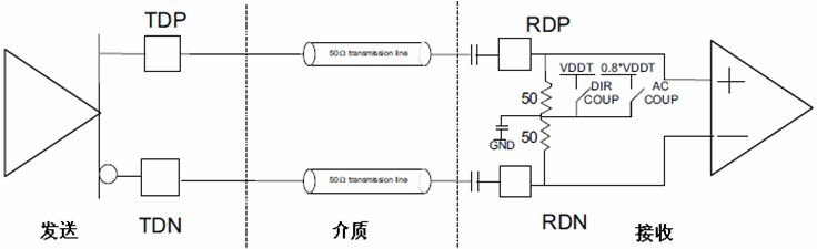 圖3是TLK3132高速串行接口的AC耦合框圖,采用CML高速電平接口,發(fā)送側(cè)內(nèi)部集成了50歐姆的匹配電阻。接收端支持DC和AC耦合,若采用直流耦合時,共模電壓由發(fā)送側(cè)決定,匹配電阻直接上拉到VDDT,若采用交流耦合,為得到最優(yōu)的共模偏置電壓,選擇芯片內(nèi)部0.8VDDT的偏置電壓。在實際電路設(shè)計中,推薦采用交流耦合方式,容易實現(xiàn)不同接口的電平轉(zhuǎn)換,并可去除共模噪聲,避免外界噪聲對接收端的影響。