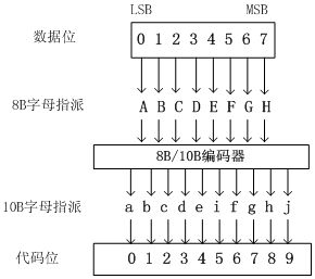 在串行鏈路通信中,為了實現(xiàn)信號時鐘的恢復(fù),需要避免出現(xiàn)長串0和長串1,同時保持電路上正負(fù)電平平衡,能正確地交流耦合避免信號失真,需要傳輸信號中的0和1數(shù)量數(shù)目相等,因此業(yè)界廣泛應(yīng)用8B/10B編解碼方法:實現(xiàn)8B到10B的映射(圖4),即一個字節(jié)(8bits)用10bits來表示,從中挑選出連續(xù)0或者1個數(shù)不會超過3個,0和1的個數(shù)差不大于2 (最多6個’0’或’1’)。