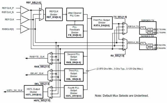 SERDES實現(xiàn)的一個關(guān)鍵技術(shù)是時鐘的產(chǎn)生和分布,圖5是TLK3132芯片內(nèi)部的時鐘架構(gòu)。時鐘配置非常靈活,支持單端或差分參考時鐘輸入,同時包括多個高頻鎖相環(huán)電路: