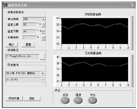 采用CC2531作為溫度數(shù)據(jù)的匯聚節(jié)點,采用IEEE 802.15.4協(xié)議組成一個由10個采集終端組成的星狀網(wǎng)絡,對終端節(jié)點的溫度進行采集。終端節(jié)點硬件由CC2530實現(xiàn),溫度傳感器采用DS18B20.上位機由Visual C++編寫,實現(xiàn)數(shù)據(jù)的實時顯示,并實現(xiàn)數(shù)據(jù)的存儲和歷史溫度查詢。CC2531的USB設備描述符里聲明PID=0x1000,VID=0x0451,UBS驅(qū)動采用Windows XP系統(tǒng)提供的usbser.sys.溫度采集結(jié)果如圖5所示。