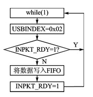 下面以IN端點2為例,說明數(shù)據(jù)如何通過USB接口傳遞到電腦上。當電腦發(fā)出IN請求時,如果USB端點2的FIFO非空,就向電腦發(fā)送FIFO里的內(nèi)容;如果FIFO為空,則向電腦發(fā)送一個空包作為回應。CC2531通過寄存器位USBCSIL.INPKT_RDY來控制電腦和8051 MCU內(nèi)核對USB的FIFO的使用權(quán)。當INPKT_RDY=1時,電腦正在對USB端口進行訪問,8051 MCU內(nèi)核無法向FIFO內(nèi)寫入數(shù)據(jù);當INPKT_RDY=0時,8051 MCU內(nèi)核可以將發(fā)送數(shù)據(jù)寫入FIFO內(nèi),置位INPKT_RDY=1,完成數(shù)據(jù)的上傳。其流程如圖4所示。