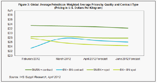 IHS iSuppli公司的多晶硅價格指數(shù)預示,未來幾個月,現(xiàn)貨市場和合同談判中的多晶硅價格都將下跌。但IHS iSuppli公司的研究顯示,多晶硅的價格可能發(fā)生變化,這不僅合同類型,而且取決于純度、供應(yīng)商所在位置和合同條款。例如,6月份9N/9N+純度的多晶硅合約價格預計會從2月時的33.40美元降至32.20美元。同時,6月份9N/9N+純度的多晶硅現(xiàn)貨價格預計從2月時的27.90美元降到24.40美元,如圖2所示。[member]