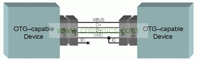 在標準 USB 中,主機上的插孔被稱作“A”連接器,而外圍設備上的插孔被稱作“B” 連接器。由于目標終端設備主要為一些小型移動消費類電子產(chǎn)品,因此標準“A”插孔對這些產(chǎn)品來說過大。按照 OTG 規(guī)范的原始版本,這些新型連接器被稱作“迷你”連接器。隨后,對該規(guī)范進行了修改,以強制規(guī)定 OTG 設備的“微型”連接器。特別是,OTG 設備必須實施一個微型 AB 插孔。這種 AB 名命表示其為批量安裝在某個單一設備中的“A”和“B”插孔。該微型 AB 插孔可以插接微型 B 插頭或者微型 A 插頭。問題似乎很清楚:如果您插一個微型 A 插頭,則設備會為一個主機;如果您插一個微型 B 插頭,則其為一個外圍設備。但是,基于微型 AB 的產(chǎn)品如何知道插入的是什么呢?OTG 規(guī)范給標準 USB 系統(tǒng)的四個觸點又增加了一個觸點,稱作 ID。由于 ID 引腳不在標準 USB 連接中,因此規(guī)范保留了這一點,并在 ID 引腳上定義了一個無連接,作為初始外圍設備。反過來,如果 ID 引腳接地,則設備扮演初始主機角色,如圖 1 所示。
