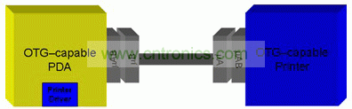 如上所述,線纜方向決定著連接處兩個 OTG 設備扮演的設備角色。主機通信協(xié)議 (HNP) 定義了一種在主機和設備角色之間動態(tài)切換的方法。為什么要切換角色呢?如果我們查看圖 2,并考慮到每個 OTG 設備都必須包括一個 TPL,我們便能理解這種要求。左邊的設備在其 TPL 上有一臺打印機,但其并“不”在打印機的 TPL 上。如果用戶“倒過來”插入線纜(如圖 2 所示),則如果不倒置角色兩個設備之間的通信便不可能進行。把線纜從兩個設備取下,然后將線纜端點倒過來再重新連接,便可以實現(xiàn)通信。OTG 規(guī)范內(nèi)置到了協(xié)議中,以自動地應對這種情況。HNP 允許靜默和自動角色倒置,從而實現(xiàn)通信。相比強制規(guī)定用戶斷開線纜然后倒置,這樣做提高了最終用戶體驗。正因這樣,需要注意的主機通常為 A 設備但卻并非始終如此,這一點很重要。