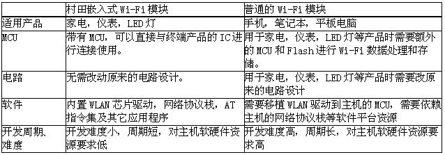 用于通訊產(chǎn)品的Wi-Fi模塊,因?yàn)榻K端產(chǎn)品,如手機(jī),筆記本具有強(qiáng)大的CPU和Flash進(jìn)行數(shù)據(jù)處理和存儲(chǔ),因此在使用Wi-Fi時(shí)不需要額外的MCU。但是用于家電,儀表,LED燈等產(chǎn)品的Wi-Fi模塊,因?yàn)榻K端產(chǎn)品的MCU和Flash都無(wú)法支持Wi-Fi的功能,因此需要額外的MCU和Flash進(jìn)行數(shù)據(jù)處理和存儲(chǔ)。為在這些產(chǎn)品上的應(yīng)用提供方便,簡(jiǎn)單的解決方案,村田開(kāi)發(fā)了帶有MCU的Wi-Fi模塊-嵌入式Wi-Fi模塊。