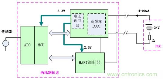 圖一的電路中,傳感器的信號經(jīng)過ADC轉(zhuǎn)換成數(shù)字信號,再經(jīng)MCU發(fā)送給電流環(huán)DAC及HART調(diào)制器,形成4-20mA的信號輸出,電流環(huán)DAC從PLC輸出的4-20mA總線上取電,經(jīng)內(nèi)置的電壓調(diào)節(jié)器輸出3.3V及2.5V,給MCU及HART調(diào)制器提供少量的電源。