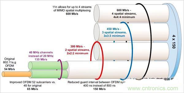 搜各種百科資料IEEE802.11詞條,我們可以讀到,從802.11n開(kāi)始,數(shù)據(jù)傳輸速率或者說(shuō)承載的數(shù)據(jù)量有了很大的提升。首先,802.11n有了40MHz模式,然而按照之前的理論,它的發(fā)射范圍應(yīng)該因此降低一半才對(duì),但事實(shí)上數(shù)據(jù)反而提升了一倍(70m),這又是怎么一回事?