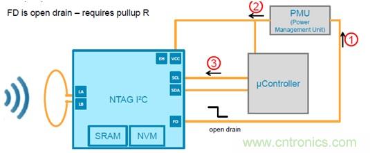 為了省電,整個(gè)系統(tǒng)可以通過FD 引腳檢測(cè)到有外部場(chǎng)強(qiáng)時(shí)喚醒主控,F(xiàn)D腳拉低喚醒: