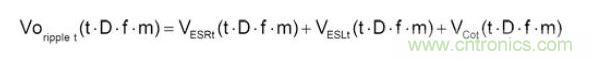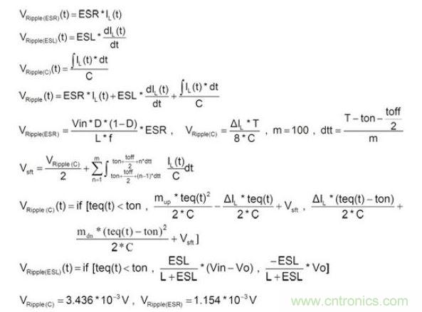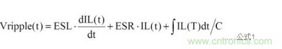 一般而言,在穩(wěn)態(tài)(Steady State)及負(fù)載固定時(shí),輸出電容的紋波電壓主要是由電感的紋波電流造成,可先計(jì)算出電感的紋波電流,再利用歐姆定律,電感微分公式及電容電荷儲(chǔ)存公式,分別計(jì)算出ESR、ESL及Capacitance的紋波電壓。再將此三種紋波加總起來(lái),便可得輸出電容的紋波電壓,如公式1所示: