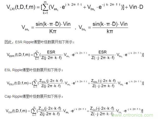 基于此因素,本文將以傅里葉函數(shù)(Fourier Series Expansion)方式來(lái)探討同步交換式降壓轉(zhuǎn)換器(Synchronous Step Down Converter)輸出電壓紋波的波形,并依電容完整等效串聯(lián)電阻(ESR)、等效串聯(lián)電感(ESL)、電容值(Capacitance)對(duì)應(yīng)的公式,經(jīng)由理論推導(dǎo),有效地分析電源模塊輸出端紋波成分。