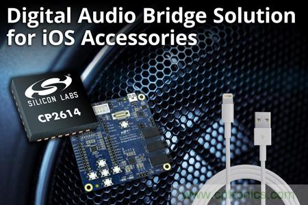 【導(dǎo)讀】近日,Silicon Labs(芯科科技有限公司)宣布,推出一款數(shù)字音頻橋接芯片CP2614和評(píng)估套件,旨在簡化iOS設(shè)備配件的開發(fā)以及助力于iOS設(shè)備配件的創(chuàng)新。CP2614為各類使用全數(shù)字閃電連接器的MFi設(shè)備(Made for iPod、iPhone或iPad)提供完整交鑰匙音頻橋接解決方案,同時(shí)也包括各類音頻配件。
