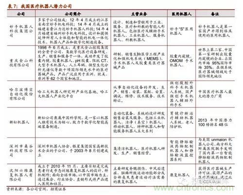 隨著醫(yī)用機器人技術(shù)的不斷突破和發(fā)展,從2005年開始我國有一批重點高??蒲嗅t(yī)院單位及研究所在研究醫(yī)用機器人系統(tǒng)并取得了一些小成就,比如哈工大的微創(chuàng)腹腔外科手術(shù)機器已經(jīng)成功被專家驗收,天津大學(xué)的妙手機器人在今年3月份開始臨床使用;同時,隨著醫(yī)用機器人商業(yè)化市場化的可能性愈發(fā)明晰,已經(jīng)有部分企業(yè)正在生產(chǎn)或者打算進軍醫(yī)用機器人細分行業(yè),其中就包括機器人領(lǐng)先企業(yè)的博實股份和新松機器人。