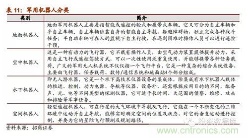 (五)軍事機器人是21世紀(jì)各國軍事安全重點戰(zhàn)略:蒂爾集團稱未來10年全球無人機研發(fā)投入和采購需求將達到940億美元。軍用機器人強國包括美德英法意以日韓,這些國家不僅在技術(shù)處于研究的先列,其產(chǎn)品已經(jīng)在軍事上有了實際運用;我國與這些強國的技術(shù)差距明顯,受政策支持,軍事機器人相關(guān)企業(yè)發(fā)展前景明顯良好,可能成為企業(yè)未來強勁的收入保證。