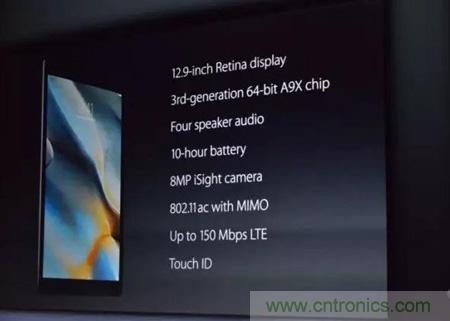 iPad Pro采用了12.9存屏幕,寬度和iPad Air的長度一樣,分辨率高達2,732*2,048,擁有560萬像素,比MacBook Pro還要高。后置800萬像素攝像頭。iPad Pro搭載A9X處理器,擁有了桌面級的處理器性能,速度是A8處理器的1.8倍,內(nèi)存帶寬是A8X的2倍。同時在機身四周配置四個揚聲器,是iPad Air 2音量的三倍。蘋果聲稱iPad Pro比80%的筆記本電腦的處理速度都要快。新款iPad Pro的CPU處理能力是初級iPad 22倍,圖形處理能力是初級360倍。