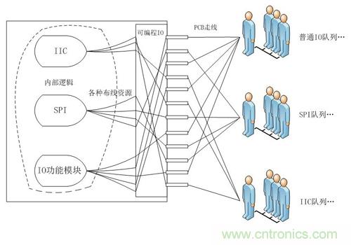 實(shí)際FPGA內(nèi)部并不像圖2那么簡(jiǎn)單,這里只是為了形象說(shuō)明可編程IO可以使內(nèi)部邏輯和PCB可以相對(duì)獨(dú)立設(shè)計(jì)。對(duì)于同類接口,不必因?yàn)镻CB改變而更改時(shí)序邏輯,只需要更改引腳分配,大大簡(jiǎn)化了PCB的布線難度。