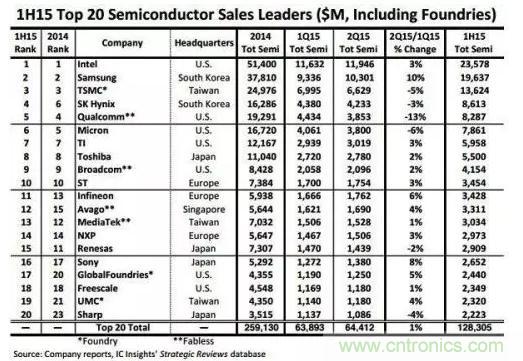 IC Insights的2015上半年全球前二十大半導(dǎo)體供貨商排行榜(包含晶圓代工業(yè)者)