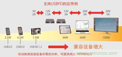 在這方面ROHM公司先行一步,近日ROHM公司宣布,推出支持在USB Type-C接口中實現(xiàn)USB Power Delivery(以下稱USBPD)功能的供受電控制器IC——BM92TxxMWV系列,該器件可實現(xiàn)高達100W(20V / 5A)的供受電,而以往的USB Type-C接口的供受電能力僅為7.5W。BM92TxxMWV系列IC的推出,使得筆記本電腦和TV等需要較大功率的設備,也可通過USB端子供電來驅(qū)動;同時,在智能手機和平板電腦等USB端子的傳統(tǒng)用途中,還可實現(xiàn)比以往高約4倍以上的快速充電。