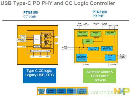 不同的應(yīng)用場景,不同的復(fù)雜度層次,NXP有不同的產(chǎn)品和方案來搭配,為設(shè)計(jì)者提供達(dá)到系統(tǒng)最佳化的方案。下圖中展示了NXP的CC邏輯控制和PD PHY方案。吳韶阡介紹說,如果是低于15W的供電,或者是不需要支持多功能的設(shè)計(jì),可以采用簡單的CC邏輯控制;而一個完整的USB Type-C方案就需要使用完整的PD方案,相應(yīng)的元器件也會增加。