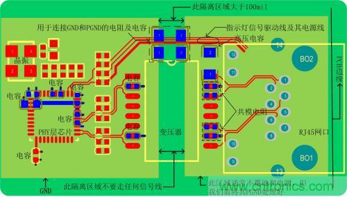 e)變壓器的兩邊需要割地:即RJ45連接座和變壓器的次級線圈用單獨的隔離地,隔離區(qū)域100mil以上,且在這個隔離區(qū)域下沒有電源和地層存在。這樣做分割處理,就是為了達到初、次級的隔離,控制源端的干擾通過參考平面耦合到次級;