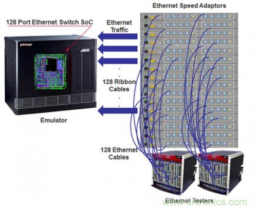 今天,以太網(wǎng)交換機(jī)和路由器已達(dá)到 256 個(gè)端口(到年底將會(huì)增加到 1024 個(gè)端口),而且它們可處理高達(dá) 120 Gb/s 的流量。同時(shí),網(wǎng)絡(luò)交換的延遲也在持續(xù)下降中,最低延遲已降至 1 µs。所有這些因素促使如今的網(wǎng)絡(luò)交換機(jī)和路由器芯片成為有史以來(lái)最大規(guī)模的芯片,達(dá)到了五億門(mén)級(jí)。在流片完成之前驗(yàn)證此類復(fù)雜 IC 設(shè)計(jì)是一項(xiàng)難以完成的任務(wù)。我們來(lái)考慮下具有 128 端口以太網(wǎng)接口的 SoC 設(shè)計(jì)。