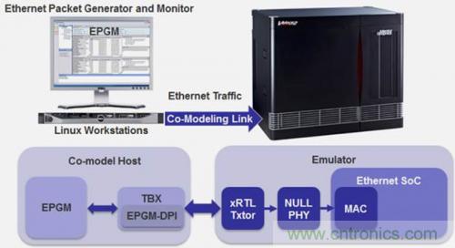 在此場(chǎng)景中,以太網(wǎng)測(cè)試儀模型運(yùn)行于連接到硬件仿真器的Linux工作站上?;诔墒斓膶?shí)現(xiàn) IP,模型準(zhǔn)確再現(xiàn)了實(shí)際的物理測(cè)試儀。這種虛擬測(cè)試儀包括以太網(wǎng)數(shù)據(jù)包生成器和監(jiān)視器 (EPGM),可以為 1G、10G、40G/100G 和 120G 網(wǎng)絡(luò)分別配置 GMII、XGMII、XLGMII/CGMII 和 CXGMII 接口。每個(gè)支持的MII端口都需要一個(gè) xRTL 事務(wù)處理器(圖 2)。
